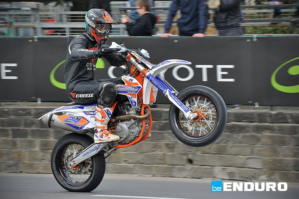 beENDURO : « alors Nicolas, comment t’es tu préparé pour ta seconde participation au célèbre Superbiker de Mettet ? » Nicolas Charlier : « c’est effectivement ma seconde participation au Superbiker, l’année passée j’avais pris part à l’épreuve, mais tout était nouveau pour moi, je n’avais jamais roulé en supermoto. Du coup j’avoue que j’avais été un peu impressionné d’être passé du spectateur invétéré au pilote sur la piste … tellement que, en manque d’expériences et surtout sur mon petit nuage, je n’avais pas réussi à me qualifier. Mais j’étais reparti très content malgré tout de cette première expérience … J’en ai retenu des leçons et je me suis bien préparé pour cette 30ème édition. Quand je n’avais pas d’enduro durant la saison, j’ai enchaîné les sorties en supermoto. Cette préparation m’a permis d’arriver en meilleures conditions. »